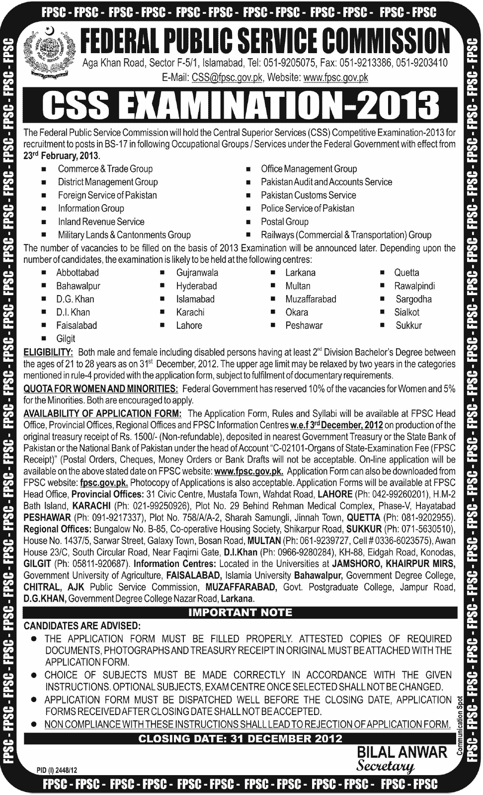 The Application Form, Rules and Syllabi will be available at FPSC Head Office, Provincial Offices, Regional Offices and FPSC Information Centres w.e.f 3rd December, 2012 on production of the original treasury receipt of Rs.1500/- (Non-refundable), deposited in nearest Government Treasury or the State Bank of Pakistan or the National Bank of Pakistan under the head of Account “C-02101-Organs of State-Examination Fee (FPSC Receipt)” (Postal Orders, Cheques, Money Orders or Bank Drafts will not be acceptable. On-line application will be available on the above stated date on FPSC website: www.fpsc.gov.pk. Application Form can also be downloaded from FPSC website: fpsc.gov.pk. Photocopy of Applications is also acceptable. Application Forms will be available at FPSC Head Office, Provincial Offices: 31 Civic Centre, Mustafa Town, Wahdat Road, LAHORE (Ph: 042-99260201), H.M-2 Bath Island, KARACHI (Ph: 021-99250926), Plot No.29 Behind Rehman Medical Complex, Phase-V, Hayatabad PESHAWAR (Ph: 091-9217337), Plot No.758/A/A-2, Sharah Samungli, Jinnah Town, QUETTA (Ph: 081-9202955). Regional Offices: Bungalow No. B-85, Co-operative Housing Socieity, Shikarpur Road, SUKKUR ( Ph: 071-5630510), House No. 1437, Sarwar Street, Galaxy Town, Bosan Road, MULTAN (Ph: 061-9239727-Cell # 0336-6023575), Awan House 23/C, South Circular Road, Near Faqirni Gate, D.I.Khan (Ph: 0966-9280284), KH-88, Eidgah Road, Konodas, GILGIT (Ph: 05811-920687). Information Centres: Located in the Universities at JAMSHORO, KHAIRPUR MIRS, Government University of Agriculture, FAISALABAD, Islamia University Bahawalpur, Government Degree College, CHITRAL AJK Public Service Commission, MUZAFFARABAD, Govt. Postgraduate College, Jampur Road, D.G. KHAN, Government Degree College Nazar Road, Larkana.